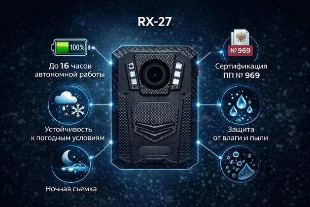 - Автономность и длительная работа: Видеорегистраторы RX-27 оснащены встроенными аккумуляторами, которые позволяют устройствам работать в автономном режиме в течение продолжительных смен, что критично для объектов с круглосуточным наблюдением.