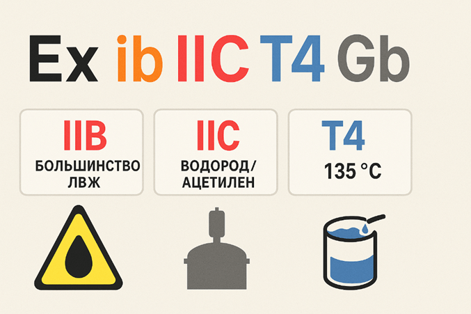 Пример маркировки: Ex d ib IIC T4 Gb (где IIC — группа газов).