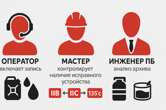 - Исполнитель/Оператор установки: Обязан включить запись перед началом операции по наряду-допуску (или перед входом в зону), проверить работоспособность и выключить после выхода из опасной зоны.